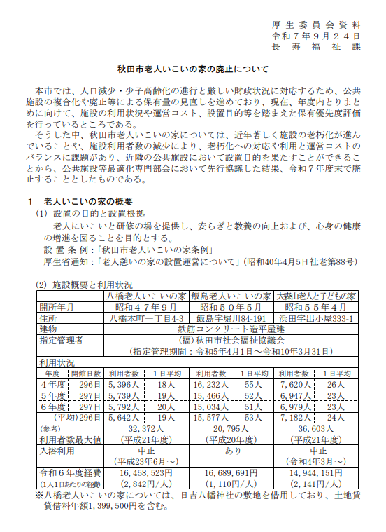 秋田市が議会に配布した資料によると、老人いこいの家の経費は年間約1500万円前後となっています。