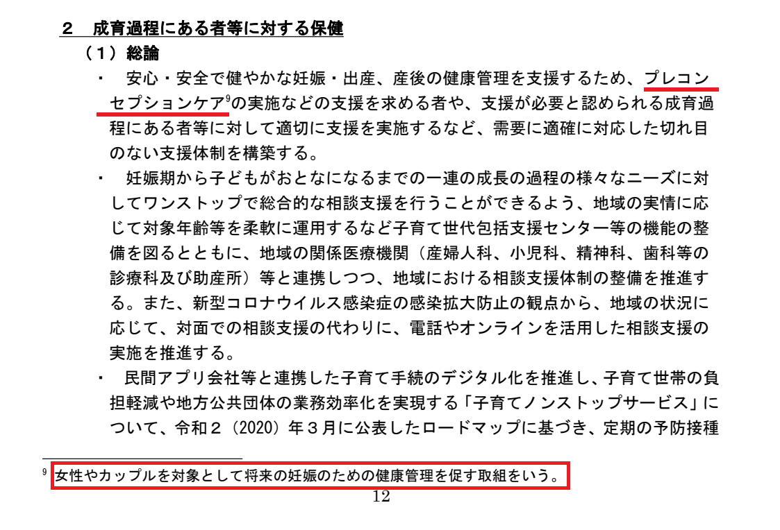 しかしこの記事では、2021年の「閣議決定」に掲載された定義「女性やカップルを対象として将来の妊娠のための健康管理を促す取組」を用います。日本の公的プレコンセプションケアの実態を、より分かりやすく伝えていると考えるためです。