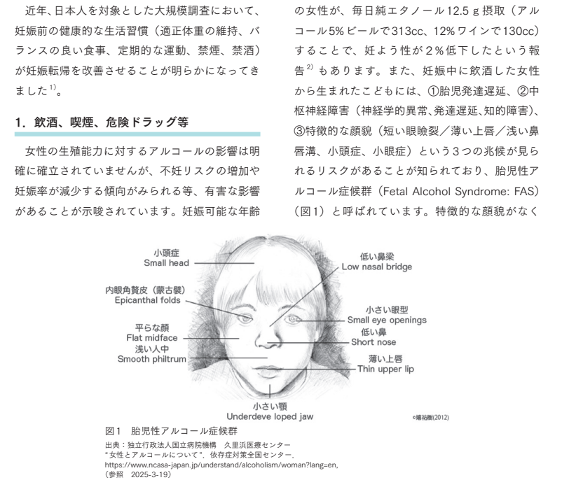 妊娠中に飲酒した女性から生まれた子どもには「小頭症」「平らな顔」「低い鼻」「小さい眼型」「薄い上唇」「小さい顎」などの特徴があり、さらに発達遅延、知的障害などの兆候が見られるリスクがある――と記されていました。