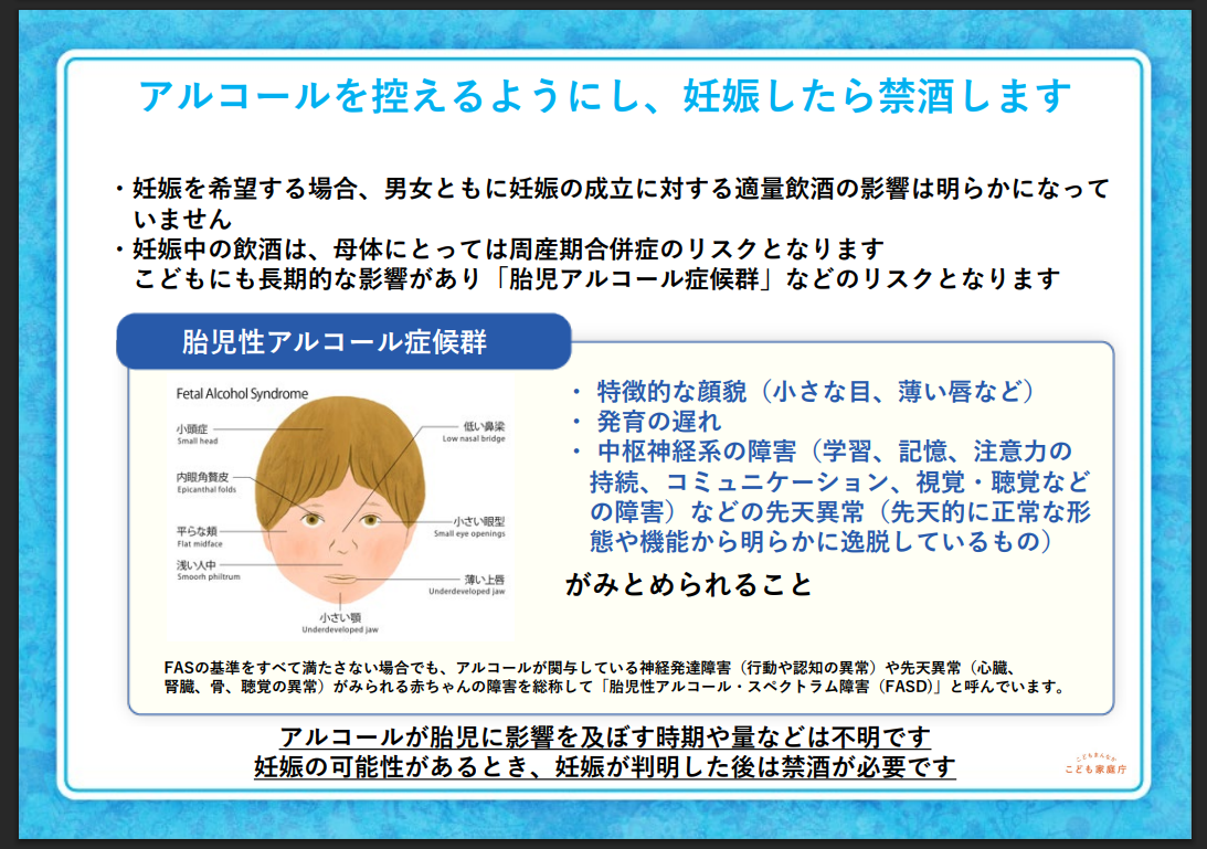 「胎児性アルコール症候群」の当事者の顔貌のイラストは、こども家庭庁の「プレコンサポーター講演用資材」の中にも掲載されていました。